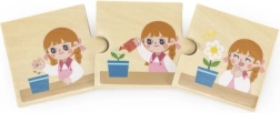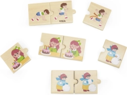 Acest puzzle din lemn de la compania VIGA oferă copilului posibilitatea de a asambla 8 seturi colorate de puzzle care ilustrează diferite activități ale copiilor în viața lor de zi cu zi. Include activități popularizate precum spălatul pe mâini, alergatul sau suflatul lumânărilor de pe tort.