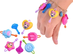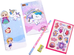 - 7 cheițe; creion; ascuțitoare; lanțișor; 2 pandantive pentru brățări; mărgele colorate; lanțișor pentru brățară; decorațiune – inimioară pliabilă; cârlige; pandantive; autocolante; caiet; riglă din carton cu prințesă; semn de carte cu unicorn