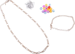 Include caiet, autocolante, creion și ascuțitoare, precum și mărgele, lanțișoare și pandantive pentru a crea propriile brățări.