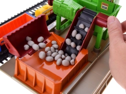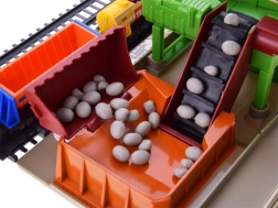 Opriți trenul la stație și, cu ajutorul elementelor mecanice, încărcați pietricelele în vagon. Copiii își exersează motricitatea fină și imaginația și trăiesc o operațiune „minieră” realistă.