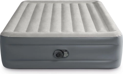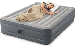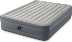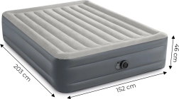Patul gonflabil premium INTEX este ideal pentru oaspeți, uz casnic și camping. Construcția înălțată, cu înălțimea de 46 cm, facilitează ridicarea, iar PVC-ul rezistent cu suprafață catifelată, impermeabilă, oferă confort și durabilitate. Pompa integrată de 220–240 V pregătește patul pentru utilizare în aproximativ 250 de secunde.
