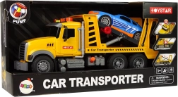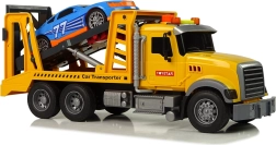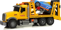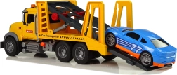 Platformă de remorcare din plastic, galbenă, cu detalii atent lucrate, care le permite copiilor să transporte mașini în mod realist. Prin apăsarea butonului portocaliu rampa se ridică, iar prin mecanismul de dedesubt poate fi coborâtă la loc. Roata de presiune integrată blochează roțile și asigură mașinuța împotriva alunecării.