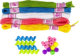 În pachet găsești o selecție bogată de mărgele în nuanțe de roz, galben, mov, verde, albastru și portocaliu și cinci fire din bumbac (verde, albastru, alb, roz, galben), fiecare cu lungimea de 8 m. Este inclus și un pieptănaș albastru practic și un ghid detaliat pentru coafare pas cu pas.