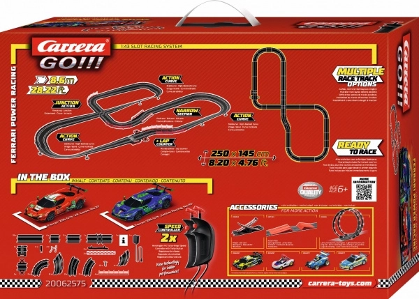 Trăiește tensiunea curselor reale cu pista auto CARRERA GO Ferrari Power Racing, lungime 8,6 m. Setul include două mașini detaliate FERRARI 296 GT3, o intersecție, curbe înclinate, îngustare de pistă și contor de ture. Datorită controlerelor cu funcție Turbo, magneților și periuțelor de contact duble, te bucuri de călătorii rapide și fluide cu aderență ridicată. Montajul ușor cu sistem de cleme și posibilitățile largi de extindere garantează distracție nesfârșită pentru copii de la 6 ani și adulți.