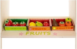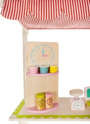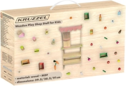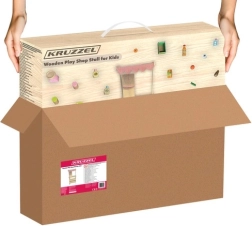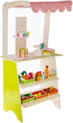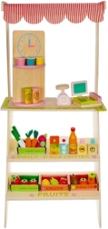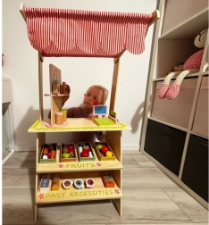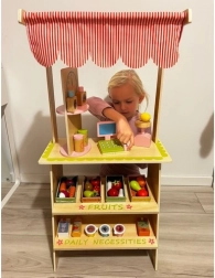Oferă-le copiilor propria piață! Standul stilat din lemn cu acoperiș în dungi, rafturi și secțiuni marcate pentru fructe și produse zilnice dezvoltă imaginația, comunicarea și motricitatea fină. Accesoriile realiste – casă de marcat cu scanner, card de plată, cântar și tablă/„ceas” rotativ – transformă fiecare cumpărătură într-o aventură captivantă.