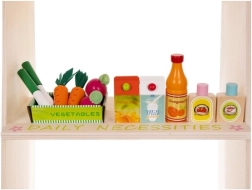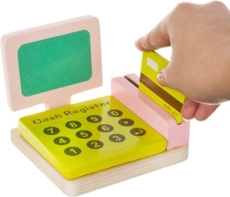 Casă de marcat cu scanner, cântar, tablă rotativă și o mulțime de alimente din lemn – tot ce au nevoie copiii pentru a-și deschide propriul magazin și a-și antrena abilitățile sociale.