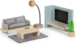Acest set de mobilier frumos realizat aduce elemente realiste jocurilor copiilor, care ajută la dezvoltarea lumi imaginare a micilor arhitecți și designeri. Copiii pot participa la joc datorită posibilității de a schimba „programul TV” cu ajutorul cardurilor interschimbabile, în timp ce lampa de podea adaugă o atmosferă reală camerei de zi.