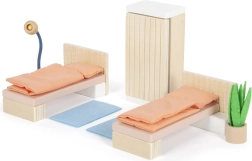 Dormitorul în miniatură pentru căsuța de păpuși de la marca Small Foot aduce farmecul mobilierului adevărat în lumea copiilor. Acest set de mobilier elegant include un pat dublu care poate fi împărțit cu ușurință în două paturi separate, oferind flexibilitate pentru diverse tipuri de joc. Include, de asemenea, două perne, două plăpumi, un dulap cu oglindă, o lampă și două covorașe, completând autenticitatea acestui dormitor în miniatură.