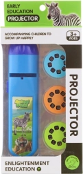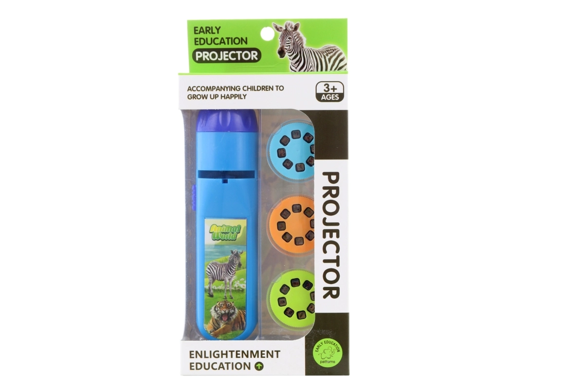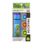 Proiector din plastic pe baterii. Include 3 discuri cu imagini (în total 24 de imagini). La apăsarea butonului, proiectorul proiectează imaginile pe perete (sau pe o altă suprafață albă). Alimentare cu 3 baterii AG13 (incluse). Dimensiuni proiector aprox. 13 x 3,5 cm. Dimensiuni ambalaj aprox. 9,5 x 20,5 x 4 cm. Vârsta 3+.