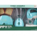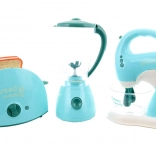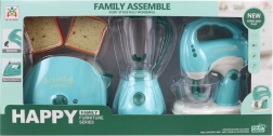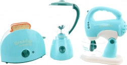 Acest set de aparate de bucătărie include un prăjitor de pâine, un blender și un mixer. Fiecare aparat este alimentat de 2 baterii AA, care nu sunt incluse. După introducerea bateriilor, prăjitorul luminează și emite sunete, blenderul se rotește și emite sunete, iar mixerul luminează, emite sunete și telurile se rotesc. Material: plastic. Ambalat în cutie. Dimensiunile ambalajului aprox. 43x22x9,5 cm. Vârsta 3+.
