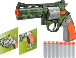 Setul include un pistol compact cu model de camuflaj, care este confortabil de ținut într-o singură mână. Gloanțele din spumă și cauciuc moale asigură siguranță maximă și ușurință. Setul include 6 gloanțe.