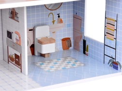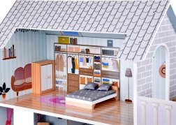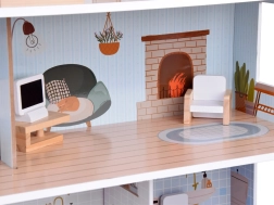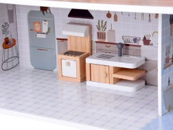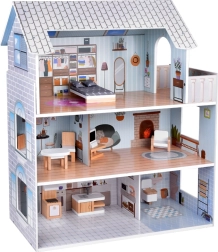 Această vilă elegantă din lemn pentru păpuși oferă trei etaje de distracție și mult spațiu pentru imaginație. Copiii vor descoperi bucătăria, baia, livingul, sufrageria și un dormitor spațios cu balcon. Tapetele, pardoselile și micile decorațiuni realiste în culori pastel creează o atmosferă primitoare pentru povești fără sfârșit.