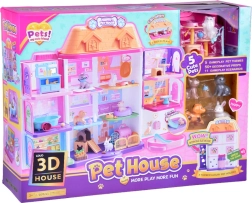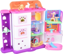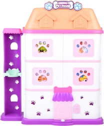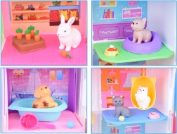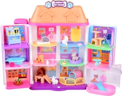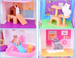Căsuța oferă 11 încăperi bine gândite, un lift cu coșuleț, terasă cu piscină și tobogan, precum și o sonerie pentru un joc și mai realist. Sunt incluse figurine din cauciuc (2 căței, 2 pisicuțe și un iepuraș) și numeroase accesorii – de la cadă și boluri, la culcușuri și ansambluri de zgâriat, până la masă de consultație și pat de spital.