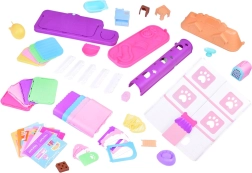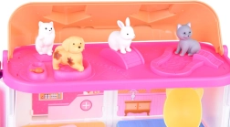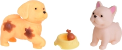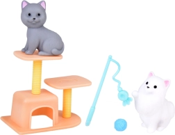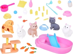 În pachet găsești 2 căței, 2 pisicuțe și un iepuraș din cauciuc moale, alături de mobilier și accesorii pentru îngrijire, joacă și relaxare.