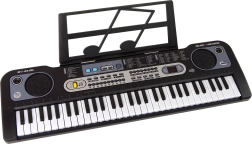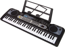 Descoperă lumea distractivă a muzicii cu claviatura electronică pentru copii, în elegantul negru, și microfon inclus. Clape iluminate, posibilitatea de reglare a volumului și a tempoului și o paletă bogată de sunete și ritmuri o fac alegerea ideală pentru micii muzicieni începători. Include suport pentru partituri, cablu și manual – totul pentru primii pași ușori către muzică.