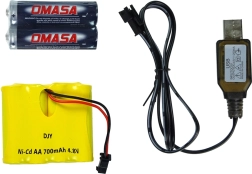 În pachet găsești mașina, telecomanda, acumulator reîncărcabil 4,8 V 700 mAh, 2× baterii AA și încărcător USB – pornești și pleci.