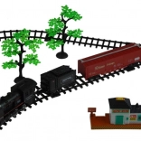 Sunt incluse locomotiva, vagonul de marfă, trei vagoane mai mici, stația, doi copaci, șinele și un dozator de apă pentru efectul de fum. Este suficient să introduci 4 baterii AA (nu sunt incluse) în vagonul de marfă, să-l conectezi la locomotivă și, după o scurtă încălzire a elementului de încălzire, să pornești la drum.