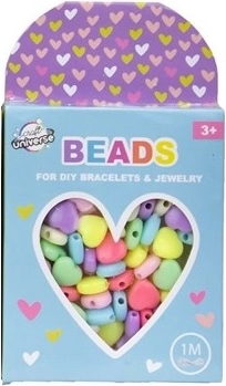 Set de mărgele colorate într-o cutie frumoasă de hârtie; pachetul include și un șnur de 1 metru pentru înșirarea mărgelelor. Mărgelele se pot înșira ușor pentru a crea brățări și coliere – pentru tine sau pentru prietene și prieteni – și pot fi combinate cu alte tipuri de mărgele din colecție (12 tipuri).