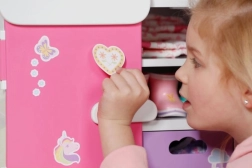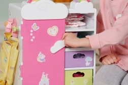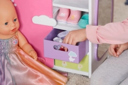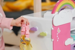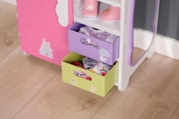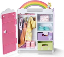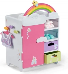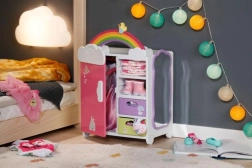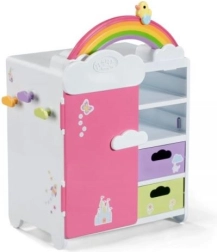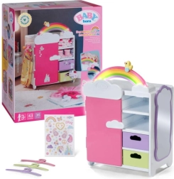 Dulăpiorul stilat pentru păpușile BABY born transformă schimbatul hainelor într-un joc magic. Curcubeul multicolor cu luminițe, melodiile vesele și soluțiile practice de depozitare cu bară pentru umerașe, polițe și sertare asigură ordine și distracție. Pe exterior nu lipsesc cârligele drăgălașe în formă de norișori, iar în interior se află o oglindă mare pentru perfecționarea ținutei. De asemenea, include o coală de autocolante pentru personalizare creativă.