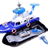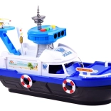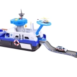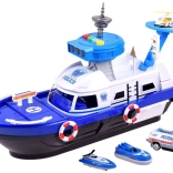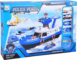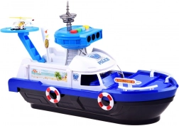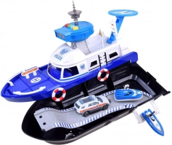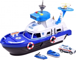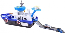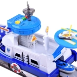 Această navă de poliție detaliată, în combinație alb-albastru, este pregătită pentru orice misiune – pe apă, pe uscat și în aer. La bord găsești heliport cu elicopter, turn de control cu efecte luminoase și sonore și spațiu interior de depozitare pentru transportul vehiculelor. Cockpitul rabatabil, cu cârmă și figurina căpitanului, amplifică realismul jocului.