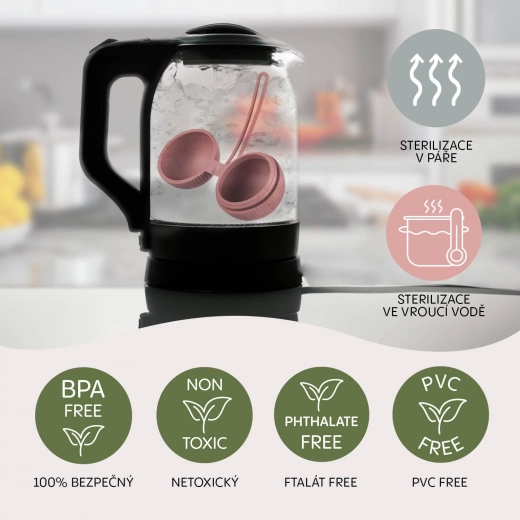 • Poate fi fiartă/sterilizată în apă fierbinte