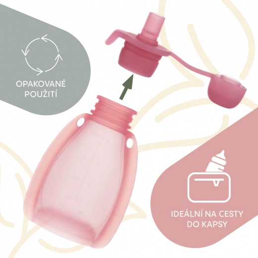 Asigurați copilului dumneavoastră o gustare proaspătă și sănătoasă cu punguța noastră din silicon reîncărcabilă ori de câte ori are poftă. Acest ajutor practic vă permite să pregătiți acasă piure de fructe sau alte bunătăți preferate pe care le puteți lua cu voi în excursie, la plimbare sau la școală. Datorită capacului sigur, etanș, conținutul rămâne proaspăt și protejat împotriva vărsării.