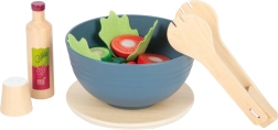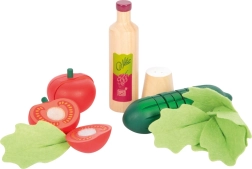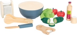 Acest set de salată modern este realizat din lemn de înaltă calitate, în combinație cu culori realiste. Setul include tot ce este necesar pentru a pregăti o salată: bol din lemn, capacul care servește ca tocător, castravete, roșie, cap de salată, răzătoare, clești, sticlă cu dressing, sare, cuțit și peeler pentru legume.