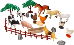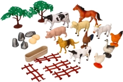 Setul include animale din plastic de dimensiuni variate, inclusiv vaci, cai, oi, găini, copaci și alte accesorii precum garduri, pietre și ouă, care asigură dezvoltarea educativă și creativă.