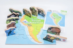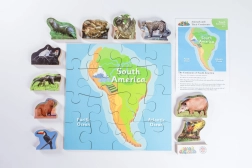 Puzzle din lemn America de Sud și animalele ei reprezintă o distracție educativă pentru copii, care combină cunoașterea continentelor și faunei lor cu o formă jucăușă de învățare.