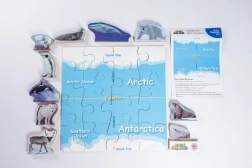 - Hartă a regiunilor polare împărțită în 16 piese, 10 figurine independente de animale, fișă informativă