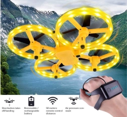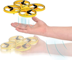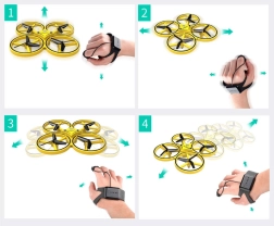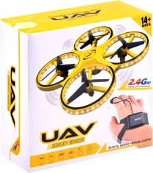 Quadcopter UAV Gravity Sensor - este o ofertă distractivă pentru copii mai mici și mai mari, care iubesc jucăriile zburătoare. Dronul complet este realizat din plastic, cu o iluminare LED fantastică, care arată grozav în întuneric. Dronul se controlează cu ajutorul unei telecomenzi speciale, care este atașată la mână precum un ceas. Se controlează cu ajutorul mâinilor, jucăria având largi posibilități de manevrabilitate, o simplă mișcare a mâinii schimbând direcția de zbor, spre dreapta, spre stânga, sus, jos. Odată lansat, rămâne în aer și se rotește în jurul axei sale la 360 de grade. Brățara trebuie ajustată la dimensiunea dorită, alunecând-o între degetul mare și arătător cu o curea prevăzută cu buton de fixare. Curelușa din silicon are 12 setări de ajustare a lățimii - va se potrivi situației fiecăruia. Jucăria este ușoară, astfel se ridică rapid în aer, cele 4 elice opuse utilizate în aceasta crescându-i stabilitatea în timpul zborului. Cum funcționează: