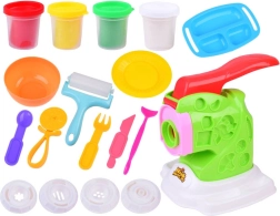 Sucitor, cuțitaș, furculiță, linguriță, tăietor pentru pizza, spatulă și veselă de servire, completate de 4× plastilină în culori de bază – ideale pentru scenarii culinare creative.