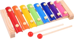 Acest xilofon colorat pentru copii este un prim instrument muzical ideal pentru micii muzicieni. Lamelele metalice în culorile curcubeului permit interpretarea unei game întregi și dezvoltă ritmul, auzul și motricitatea fină. Baza din lemn oferă stabilitate și un aspect plăcut.