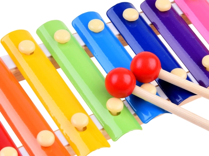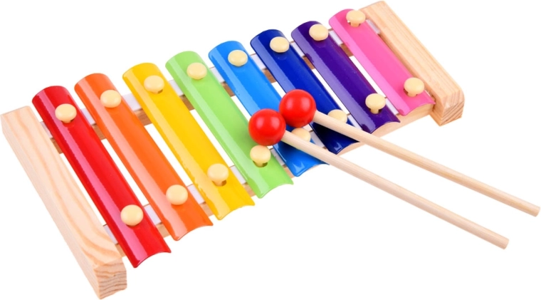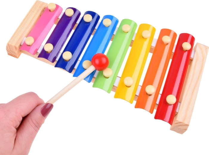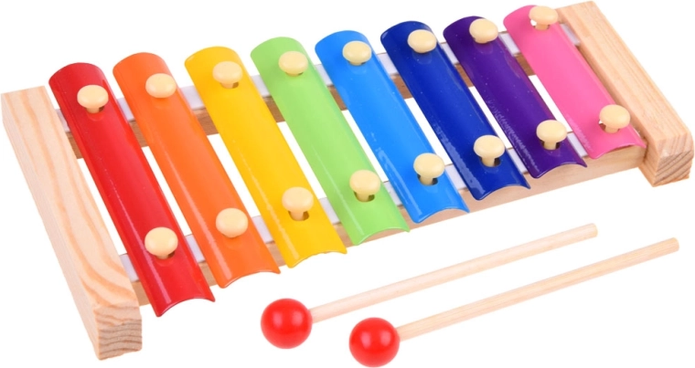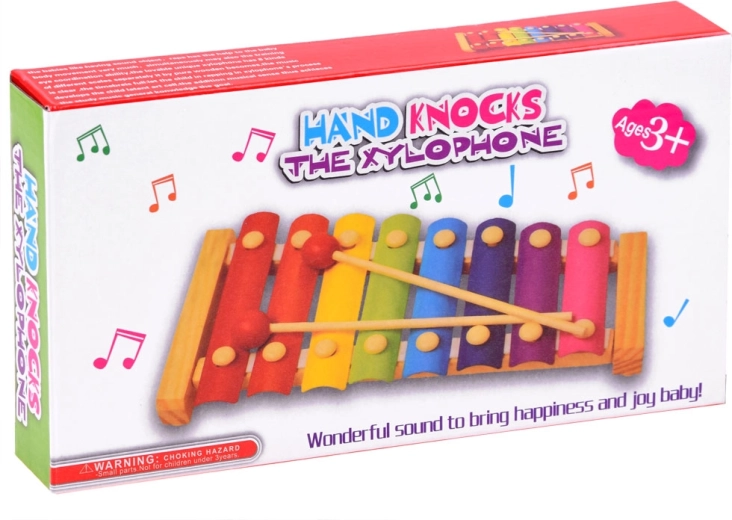 În pachet găsiți două bețe din lemn, cu o lungime confortabilă pentru mâinile copiilor, și note demonstrative pe ambalaj, datorită cărora cei mici pot învăța ușor primele melodii. Cântatul la xilofon susține concentrarea, coordonarea și creativitatea.