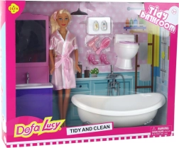 - Păpușă în halat roz, cadă albă, toaletă cu capac roz, lavoar cu oglindă, prosop, perie, uscător, pantofi roz cu toc (o pereche în plus)
