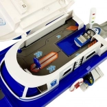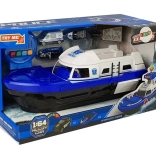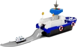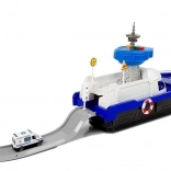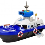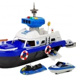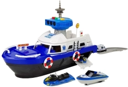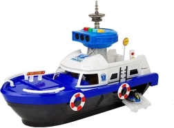 Această navă de poliție robustă, pe roți, oferă numeroase elemente interactive: punte superioară rabatabilă, rampă de acces spate pentru vehicule și compartiment ascuns sub punte. Turnul de control emite semnale de poliție cu lumină și sunet (bateriile AG13 sunt incluse). Datorită detaliilor realiste, cu colaci de salvare și inscripții, jocul devine realist și captivant.