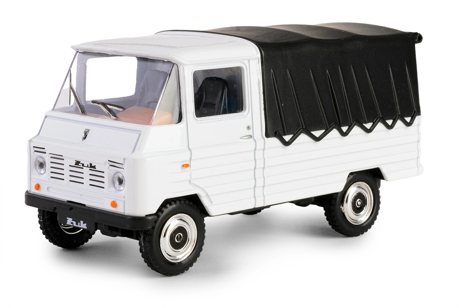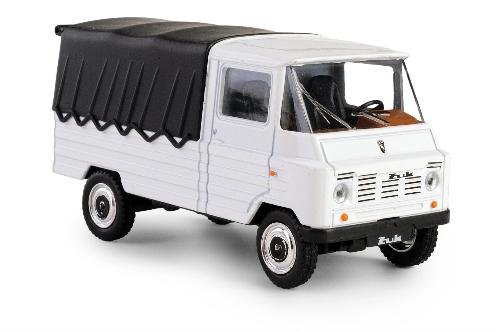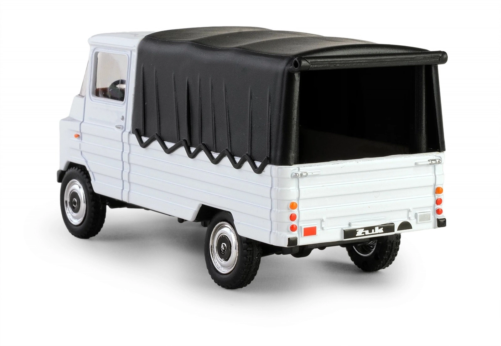 Caroseria albă cu prelată neagră, împreună cu detaliile redate cu precizie ale farurilor, grilei și roților, evocă fidel vehiculul real PRL ŻUK. Ideală pentru vitrină și ca decor stilat.