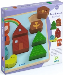 Descoperiți puzzle-ul și setul de construit din lemn, 2 în 1 – DJECO Puzz & Match Curcubeu. Două piese formează animale frumoase și modele colorate care îi încântă pe copii. Datorită pieselor late se prind ușor, se fixează ferm în cadrul din lemn și dezvoltă motricitatea fină, imaginația și coordonarea mână–ochi. Fabricat din lemn certificat FSC, potrivit de la 18 luni.