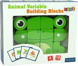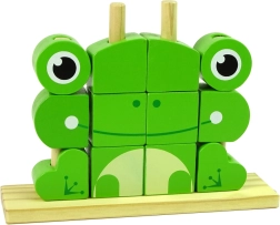 Puzzle-ul din lemn creativ în formă de broscuță este proiectat pentru a stimula creativitatea copiilor și a-i ajuta să învețe coordonarea. Include 12 piese care se fixează pe o bază cu pini, permițând crearea de diverse animale sau obiecte după imaginație.