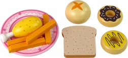 Include o farfurie și o selecție de alimente: gogoși, produse de panificație, cartofi prăjiți și un ciocănel de pui – ideale pentru servire și joc de-a bucătarul.