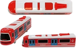 Design de mare viteză în culorile roșu și gri-albastru, cu detalii precum ferestre, inscripții și elemente de pe acoperiș care conferă autenticitate jocului.