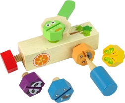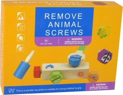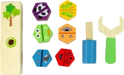 Set din lemn amuzant pentru micii meșteri care dezvoltă motricitatea fină, gândirea logică și creativitatea. Cu ajutorul cheii și al șurubelniței, copiii pot înșuruba și desface șuruburi colorate cu motive de animăluțe, exersând priza și coordonarea mână–ochi. Totul este realizat din lemn de calitate și vopsit cu vopsele netoxice.