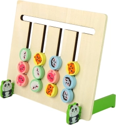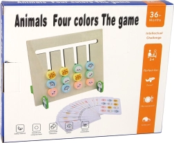 Jocul din lemn Patru culori animale combină funcția unui material didactic cu cea a unui puzzle într-o singură jucărie. Fiecare parte a plăcii are o sarcină diferită – una se concentrează pe culori, iar cealaltă pe animale, precum iepure, tigru, câine și oaie.