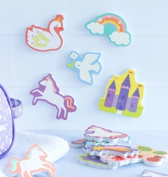 Transformă baia de seară într-o experiență magică cu jucăriile din spumă cu unicorni de la A Little Lovely Company. Setul conține 14 piese care, după umezire, se prind ușor de peretele căzii sau de faianță. Piesele sunt ușoare, nu absorb apă, se usucă rapid și se curăță ușor, astfel încât nu favorizează apariția mucegaiului. După baie, totul se depozitează comod în plasa suspendată cu ventuze.