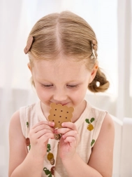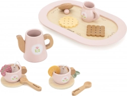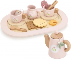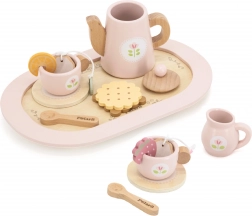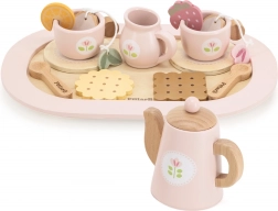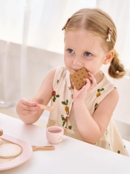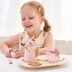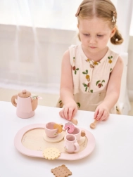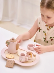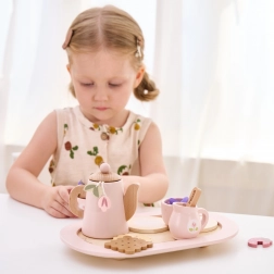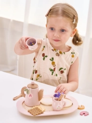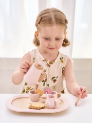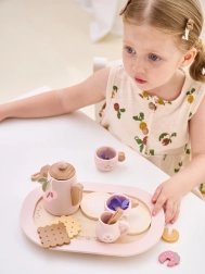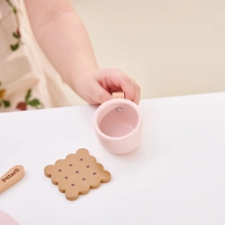 Setul oferă tot ce este necesar pentru servire: un ceainic cu capac, cești cu farfurițe, o lăptieră, lingurițe, pliculețe de ceai, felii de fructe și „biscuiți” aromați, toate pe o tavă practică. Datorită compoziției pieselor, este un accesoriu grozav pentru camera copilului în spirit Montessori și, de asemenea, un cadou frumos care va bucura orice mică gazdă.