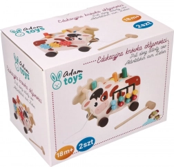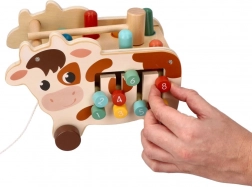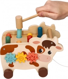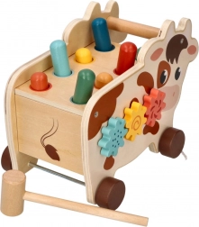 Această văcuță din lemn este alegerea ideală pentru învățare distractivă acasă și la grădiniță. Datorită combinației dintre bătutul știfturilor cu ciocănelul, angrenajele colorate și activitățile cu numere, copiii își exersează concentrarea, coordonarea ochi–mână și primele calcule. Jucăria este mobilă – are roți și șnur pentru tras, astfel încât poate însoți copiii în descoperirea lumii.