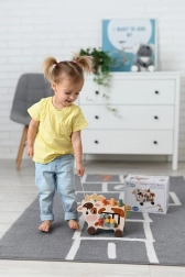 Știfturile colorate și elementele numerice susțin primele exerciții de numărare, sortare și recunoaștere a culorilor. Șnurul practic și roțile o transformă și într-o jucărie de tras îndrăgită.