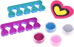 Patru culori de sclipici și autocolante pentru decorare spectaculoasă sunt completate de separatoare moi pentru degete – lăcuirea unghiilor de la picioare va fi confortabilă și precisă.