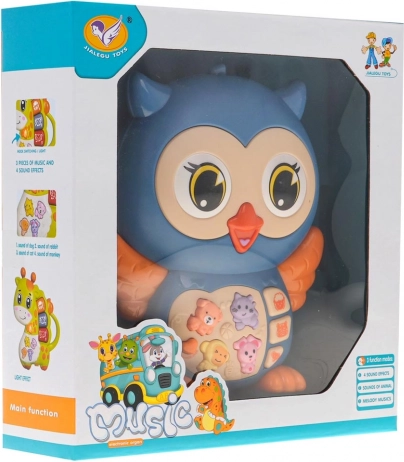 . | Bufniță interactivă cu funcții sonore și luminoase pentru copii de la 6 luni. Bufnița este realizată din plastic de cea mai înaltă calitate, rezistentă la impact și sigură pentru bebeluși, fără margini ascuțite. Bufnița este fabricată în culori vii pentru a atrage atenția copilului și a-l încuraja la joacă. Pe burtica bufniței se află un panou cu butoane care activează sunete de animale (în primul mod), melodii, sunete Do-Re-Mi (în al doilea mod) și efecte luminoase sub formă de lumini intermitente pe aripile bufniței. Modurile se schimbă cu ajutorul unui buton în formă de inimă. Jucăria are control al volumului. Este alimentată de 2 baterii AA 1,5 V (nu sunt incluse) .Funcțiile jucăriei: .- destinat copiilor de la 6 luni, .- fabricat din plastic de cea mai înaltă calitate, în culori strălucitoare, - sigur, fără margini ascuțite, - rezistent la impact, - efecte luminoase: aripi de bufniță iluminate, - efecte sonore: .* mod cu sunete de animale: câine, pisoi, maimuță, oaie, tigru, elefant, .* mod cu sunete: melodii, sunete Do-Re-Mi. |