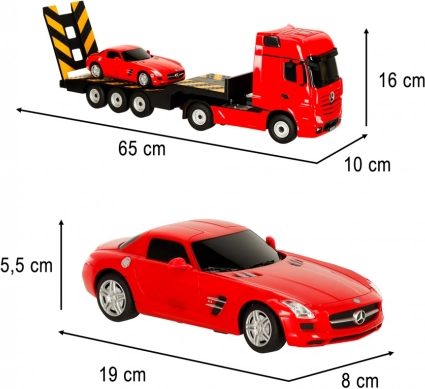 - Alimentare: Mașina are nevoie de 3x baterii AA, cap-tractorul 5x baterii AA, iar telecomanda 2x baterii AA (bateriile nu sunt incluse).